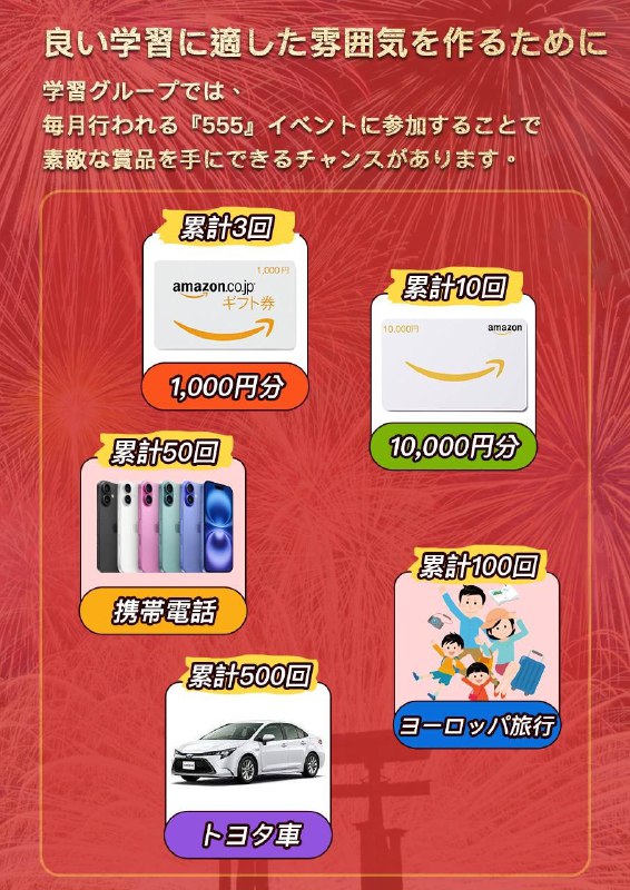 🎊毎日18:30~22:00の間、全てのメンバーが参加可能で、学習グループで【555】を送信するだけで豪華な賞品が手に入ります!